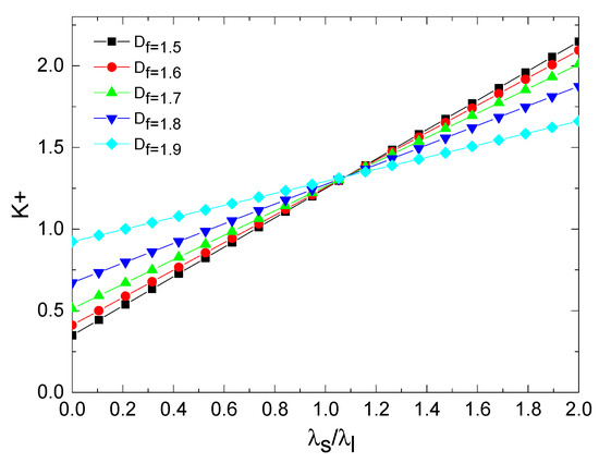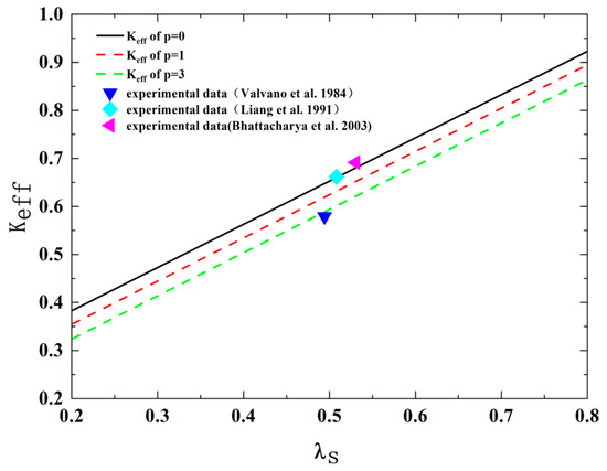 Equation (44) is the dimensionless coefficient of heat conductivity for the whole porous media. It is also a theoretical model, which can be used for analyzing the effect of structural parameters of tree-like bifurcation networks (), the porosity, , the thermal conductivity of porous media matrix, and the thermal conductivity of fluid, , on the dimensionless thermal conductivity coefficient. In Equation (44), all parameters have a clear physical meaning, and there are not any empirical constants.