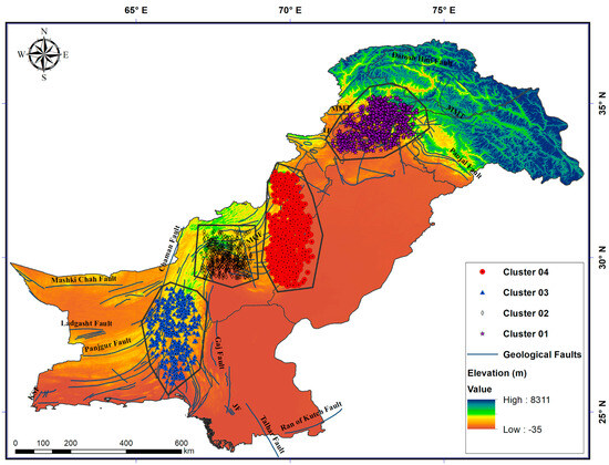 Regarding specific cluster data, cluster 01 is in the northwest part of the country and owes its seismicity to the continental collision between the Indian and Eurasian tectonic plates. This results in the formation of the great mountain massifs of Pakistan which include Hindukush, Karakoram, Pamir and Himalayas (see also Figure 1). As far as the tectonics of the north Pakistan concerns, this can be subdivided into several areas [72]. These areas are from south to north: The Salt Range, the Potwar and Kohat plateaus, the Hill Ranges, the intermontane basins, the southern Kohistan Ranges, the Nanga-Parbat-Haramosh regions, the Main Mantle Thrust, and the Kohistan island arc, which is separated from Asian rocks of the Pamirs to the north by the Main Karakorum Thrust. Seismically north Pakistan is very active and the faults within fold-and-thrust belt have been frequently producing moderate to large seismic events that include the Kashmir earthquake of 2005 that resulted in more than 75,000 lives loss in addition to a colossal economic loss [43,44,45,73,74,75,76,77,78].