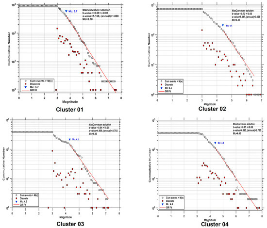 As can be observed from Table 1, the average -values of Equation (13) and of the law of Equation (13) do not differ significantly (p < 0.01) between the various clusters. However when only one standard deviation is considered the tendency of a higher Gutenberg Richter -value can be observed in cluster 02. Parameter differs only for cluster 01, potentially, due to the greater number of events that this cluster includes.