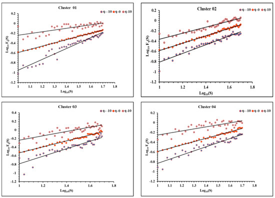 Fluctuations functions for = −10, 0 and 10 as a function of the scale per cluster data according to Equation (7) and corresponding linear trends.