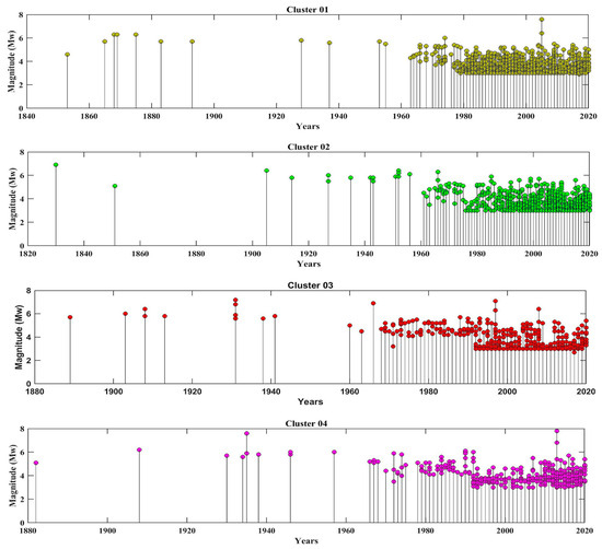 The filtered seismic catalog for Pakistan that was created from the four different source catalogs of USGS, GCMT, ISC and CES (Section 2.1) contains 2394 seismic events from 1820 to 2020. When this data were grouped in space regardless of the time of their occurrence, the event vectors were interestingly spatially grouped into four non-overlapping clusters, each of which, significantly, corresponded to a high seismicity region or, equivalently, a high seismic event density. The spatially grouped seismic events of the full filtered catalog and the associated clusters are presented in Figure 2.