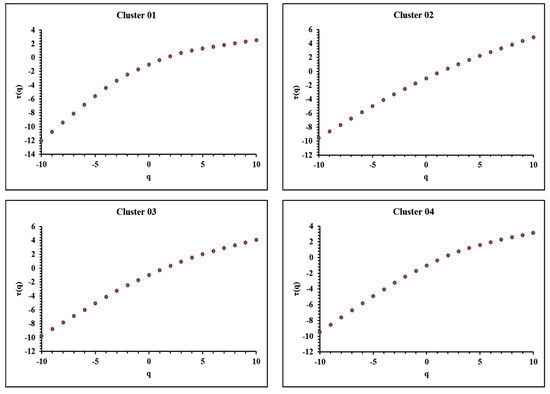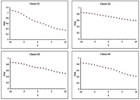 It is very interesting and has to be emphasised that the MFDFA curves of versus for clusters 03 and 04 in Figure 4 are very similar. The reader should recall in relation from Figure 2, that these clusters are near active geological faults with similar geological settings and this is reflected in the MFDFA results from the seismic data of these clusters. The MFDFA curve of cluster 01 is comparable with the curves of clusters 03 and 04 for values greater than 1.22. A reason for the similarities and discrepancies of the MFDFA curves of cluster 01 is that this cluster is located on the Main Boundary Thrust, which, on the one hand, is an important seismic geology, but, on the other hand, different from the geology of clusters 03 and 04. Another possible reason for the above discrepancies might also be that several earthquakes of cluster 01 occurred in higher elevations. The MFDFA curve of cluster 02 is different. These tendencies are also observed in Figure 6 in the curves of the generalised Hurst exponent versus and in the curves of versus in Figure 7. To retrieve both curve variations with MFDFA, the relations of versus were computationally generated for values of step 1. The generalised Hurst exponent was calculated as the slope of the batch of these least square fits and was calculated from the values according to Equation (8). The versus curves (Figure 6), as well as, those of versus (Figure 7) are similar for clusters 03 and 04. Cluster 01 has similar curves shapes with the ones of clusters 03 and 04, both for the versus variations (Figure 6) and for the versus ones, but with a different value range. On the contrary the corresponding curves for cluster 02 are different. Therefore it can be supported from the MFDFA data of all subfigures of Figure 4, Figure 6 and Figure 7 that the proximity of clusters 03 and 04 to active faults and the similarities but differentiations of geological settings of cluster 01, may explain the MFA trends. These tendencies could not have been identified on a pure statical basis as already mentioned above.