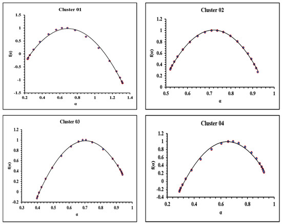Figure 8 presents the multifractality spectra of all clusters according to Equations (9) and (10). It should be emphasised that the origins of multifractality in the time series of the sub-figures of Figure 8, may result from (a) the existence of a broad probability function (b) the varied contributions of the small and big fluctuations to the overall long-range correlations (c) or from a combination of (a) and (b) [49,50,94]. The value of that corresponds to the maximum of the , curve, measures the process’ regular or irregular behaviour. The larger values of suggest that the process will be comparatively more regular [72]. In addition, the width of Equation (12) provides information on the symmetry of the multifractal spectra. Spectra that are right or left skewed are associated to the weighting of high or low fractal exponents [72]. The range of and are crucial parameters for interpretation.