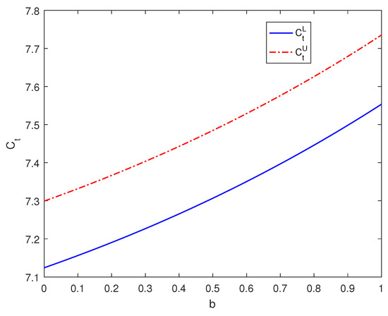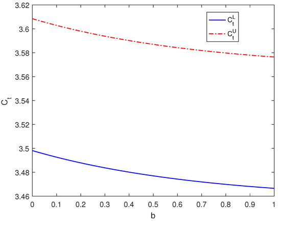 This section thoroughly investigates how the parameter b affects the pricing model by utilizing the control variable method. It provides an exhaustive examination of the sensitivity and stability of the European option pricing model, particularly considering its enduring memory characteristics amidst the backdrop of uncertainty. For simplicity, the numerical experiments use European call option pricing as an example, with European put options following analogous arguments. The parameter values match the benchmark model in Table 1. and represent, respectively, the upper and lower boundaries of European call option prices, and their associated connections can be expressed as follows: , .