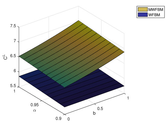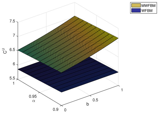 Finally, we compare the proposed pricing model to a model based on weighted fractional Brownian motion (WFBM in short). For simplicity, we ignore jumps and focus on the mixed weighted fractional Brownian motion (MWFBM in short) case. Figure 3 and Figure 4 illustrate how the fuzzy price varies with the parameters b and . The MWFBM model yields higher option prices compared with the WFBM model. Table 3 presents the -cut set intervals of the fuzzy European call price under the two models for different confidence levels . As shown in Table 3, the MWFBM intervals are greater than the WFBM ones. With the current model excluding jumps, if a confidence level of 0.97 is acceptable, any price between 6.7212 and 6.8011 can be chosen. In the event that the market value descends below 6.7212, the individual responsible for making choices regards the price as being undervalued and may opt for the acquisition of the option. Conversely, if the market price surpasses 6.8011, the decision-maker views the price as overvalued and may decide to exercise the option.