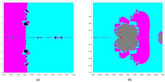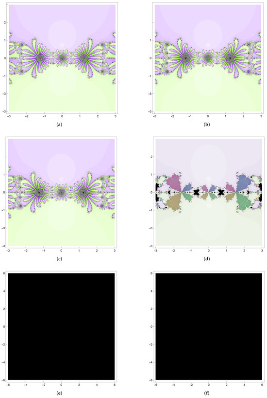 Example 1. We choose a quadratic polynomial raised to the power of two:with roots with a multiplicity of 2. Basins of attraction for (M1), (M2), (M3), (M4), (X1), and (X2) are illustrated in Figure 1. Each basin is painted in various colors. Basins for are painted purple and basins for are painted green in Figure 1 (a)–(c). At zero, its color is light (white), while becoming darker for more iterative numbers required for convergence within the set iteration. Method (M1) performs better in terms of CPU, and M4 is better in terms of avg for . There are similar lobes along the boundaries of the basins in (a), (b), and (c). Picture (d) has colored (yellow, magenta, green, blue, and so on) carrot shapes around the boundary. Methods (X1) and (X2) do not have the value of the total convergent point, and pictures (e) and (f) show the black region. Example 2. As a second test example, we selected a quadratic polynomial raised to the power of three with all real roots: The roots are with a multiplicity of 3. Basins of attraction for (M1)-(X2) are illustrated in Figure 2. Method (M4) performs better in terms of avg. Basins for are painted red and basins for are blue. There are similar lobes along the boundaries of the basins in Figure 2a–d has colored (blue, green, magenta) carrot shapes around the boundary. Methods (X1) and (X2) have considerable black points and circular patterns made up of blue diamond shapes in Figure 2e,f.