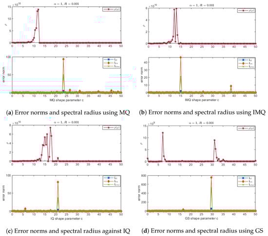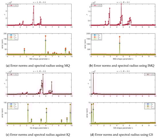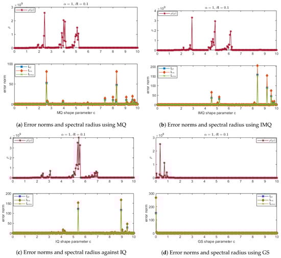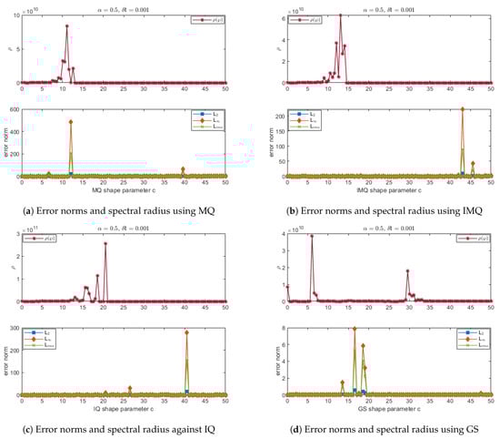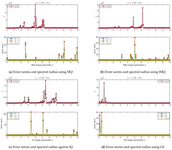 Error norms and spectral radius correspond to Example 4 when , using MQ, IMQ, IQ, and GS RBFs.