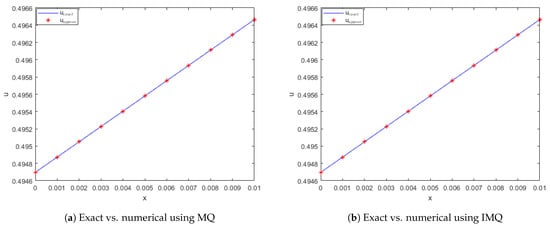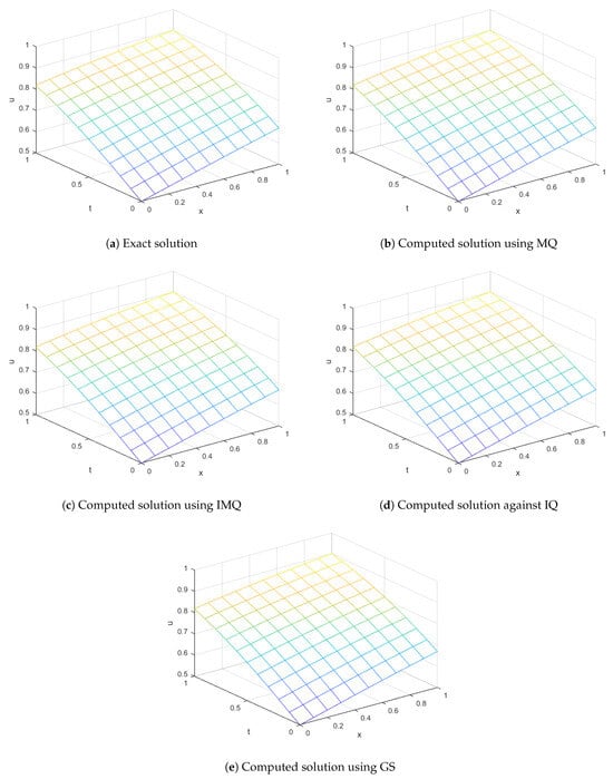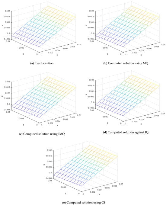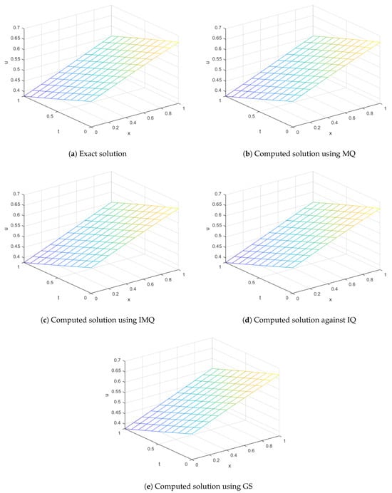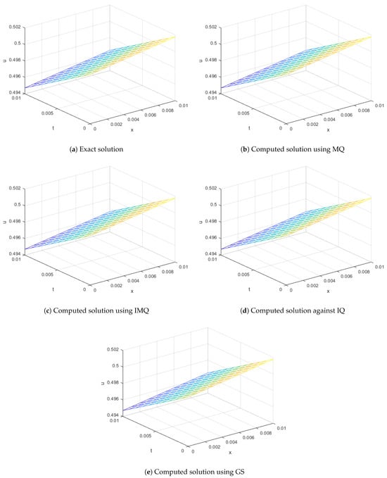 The ICs and BCs are derived from the exact solution. The approximate solution is computed using various RBFs such as MQ, IMQ, IQ, and GS with parameters , , , and . The present method is evaluated, and the results are recorded in Table 5 and Table 6 at various node points. These results are then compared with FRDTM. It can be seen that the computed solutions are more accurate than the cited method. All the RBFs exhibit good accuracy even for a small value of α.