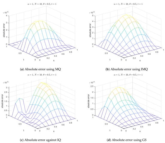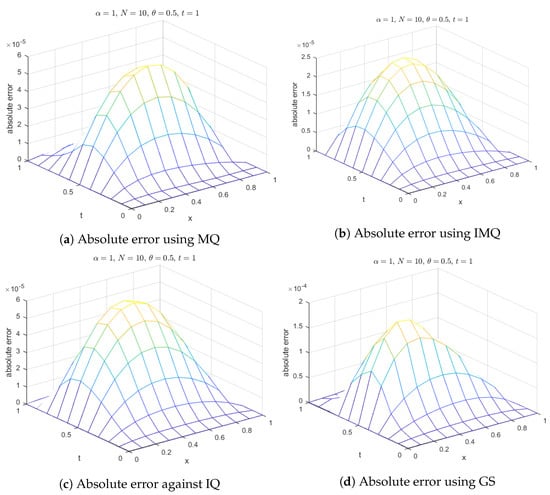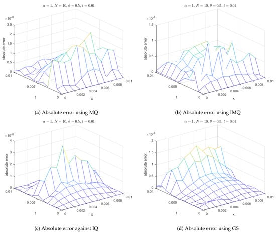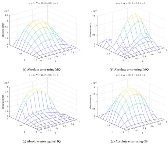 Furthermore, for , error norms at various time levels are recorded in Table 7 and Table 8 using MQ, IMQ, IQ, and GS RBFs with parameters , , and and for different values of α (0.25, 0.5, 0.75, and 1). Stability and error norm plots are displayed for MQ, IMQ, IQ, and GS RBFs against the shape parameter in Figure 9, which clearly show that the present method fully satisfies the Lax–Richtmyer stability criterion. Surface plots are presented in Figure 10, illustrating that the computed solutions using these RBFs closely match the exact solution. Absolute errors for at various time levels are shown in Figure 11, indicating reasonable accuracy. Additionally, in Figure 12, a comparison between the exact and computed solutions at the final time is displayed, demonstrating the good accuracy of the present method. Finally, Figure 13, Figure 14, Figure 15 and Figure 16 present the absolute errors for different RBFs when considering fractional order, highlighting their performance.