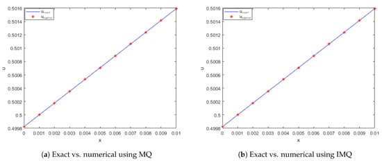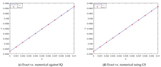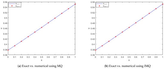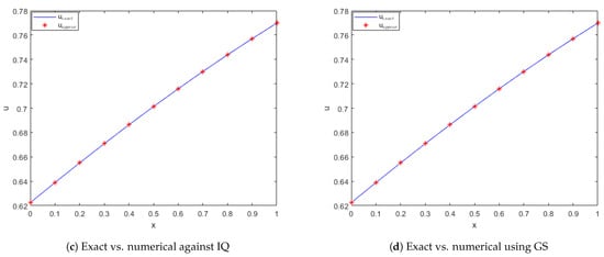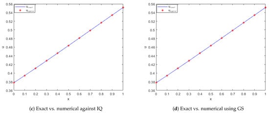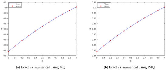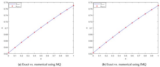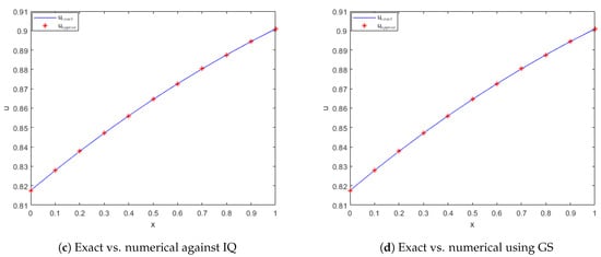 Exact vs. computed solution corresponds to Example 1 when , using MQ, IMQ, IQ, and GS RBFs.