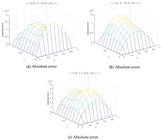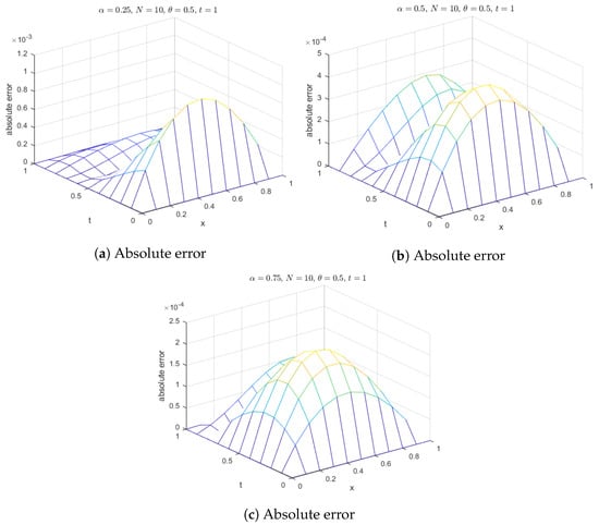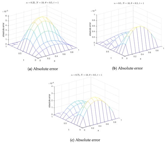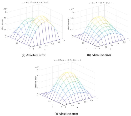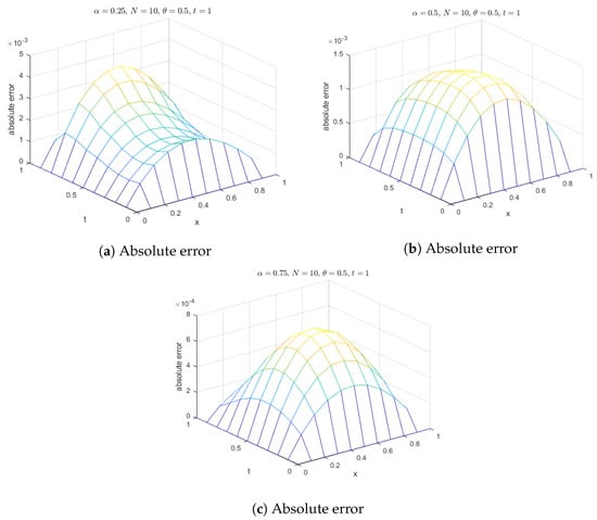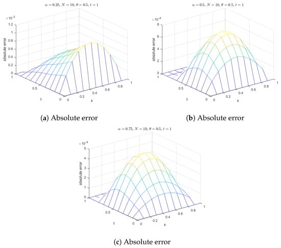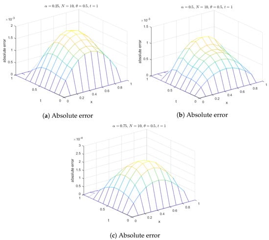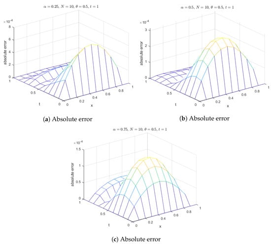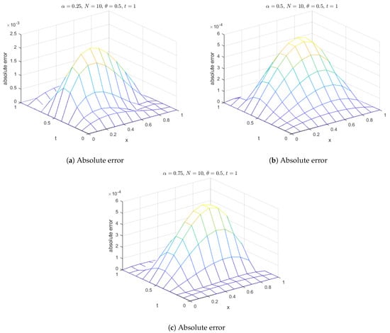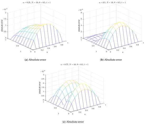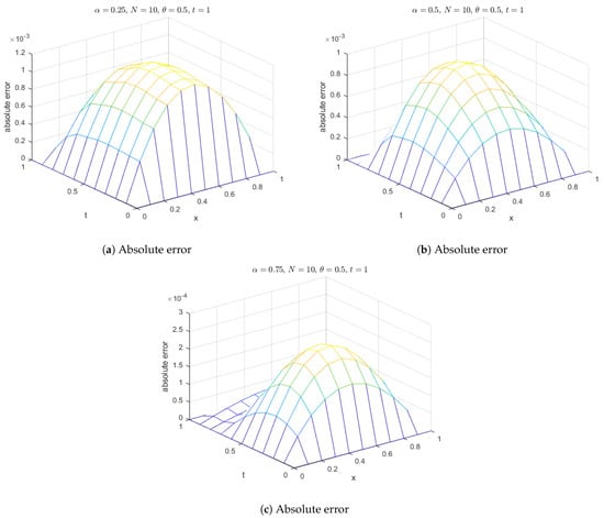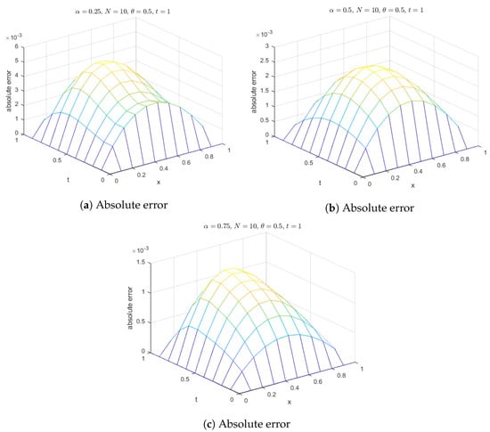 Additionally, surface plots in Figure 18 show that the computed solution using the selected RBFs closely matches the exact solution. The absolute errors for at various time levels are depicted in Figure 19, indicating reasonable accuracy. Figure 20 compares the exact and computed solutions at the final time, demonstrating the good accuracy of the present method. Finally, Figure 21, Figure 22, Figure 23 and Figure 24 display the absolute errors for different fractional orders using different RBFs.