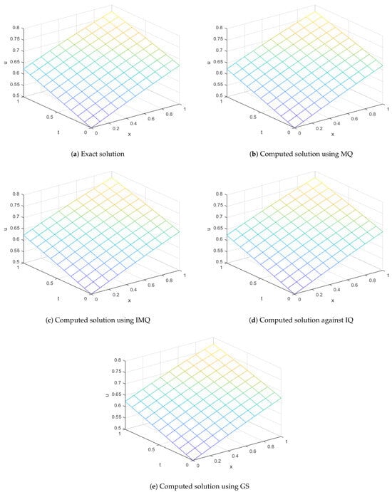 Comparison of exact and computed solution corresponds to Example 2 at and using MQ, IMQ, IQ, and GS RBFs.