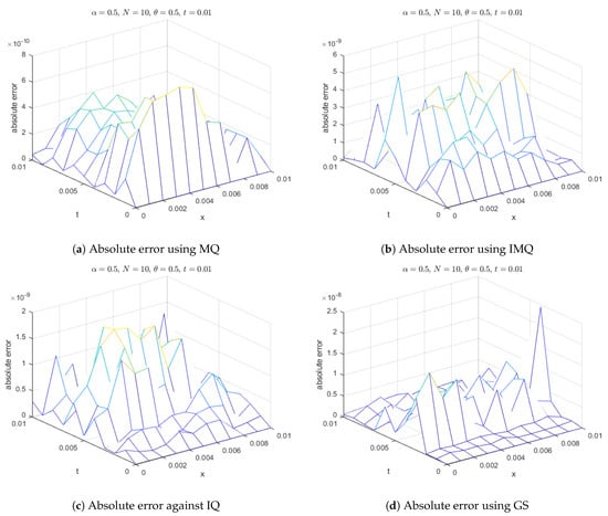 Absolute error of MQ, IMQ, IQ, and GS at t = 1 × corresponds to Example 3.