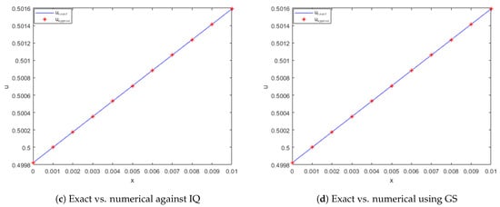 The stability and error norm plots are presented in Figure 25 and Figure 26 for and and and , respectively, for , , and , demonstrating that the present method consistently satisfies the Lax–Richtmyer stability criterion. Additionally, the surface plots in Figure 27 and Figure 28 show that the computed solution using the selected RBFs closely matches the exact solution. The absolute errors for and at various time levels are depicted in Figure 29 and Figure 30, respectively, indicating reasonable accuracy. Finally, Figure 31 and Figure 32 compare the exact and computed solutions at the final time, demonstrating the good accuracy of the present method.