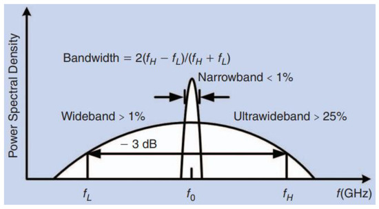 A regulated unlicensed spectrum (3.1 GHz to 10.6 GHz) belongs to a family IEEE (Institute of Electrical and Electronics Engineers) 802.15.4 a/z called UWB (ultra-wideband) defined by FCC in 2002 with an absolute bandwidth (>500 MHz) as shown in Figure 1, was specifically designed to identify a secure and accurate real-time location of the objects. The vision behind the development of the UWB radio spectrum was “to make every connected object location aware”. The UWB spectrum is widely used in smartphones, locating essential supplies in hospitals, solving problems in industries, and applications such as smart home devices control and keyless car entry. It is 100 times more accurate than Wi-Fi or Bluetooth for locating small objects within centimeters instead of meters and mostly used in tracking objects behind walls. Furthermore, it has very low latency, unlike GPS (Global Position System), for the real-time location of fast-moving objects such as drones with a faster updating speed of up to 1000 times per second—that is 3000 times faster than Bluetooth low energy (BLE). The most important application of the UWB spectrum is to calculate the distance between the two objects, and the phenomena used for this measurement is the ToF (time of flight) which is more precise than the RSSI (received signal strength indicator) method used in Wi-Fi or BLE, respectively [1,2].