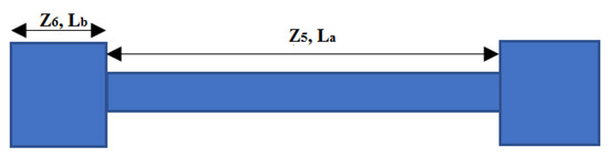 The rectangular stub resonator is responsible for the creation of the first notch band at 3.5 GHz for eliminating the WiMAX wireless application and is also called a three-step impedance resonator or low–high–low impedance section, as shown in Figure 5. The length and width of the high and low impedance lines are denoted by La (2θa) with Wa (Z5 = characteristic impedance of high section) and Lb (θb) with Wb (Z6 = characteristic impedance of low section), respectively. The impedance ratio (R) of the half wavelength step impedance resonator, when ignoring the discontinuity, is equal to the ratio of the low to high impedance sections as given below [33];