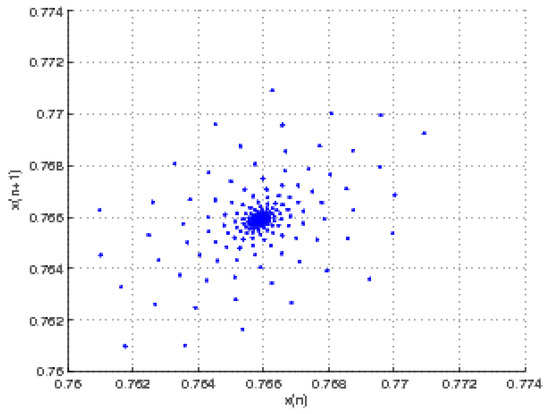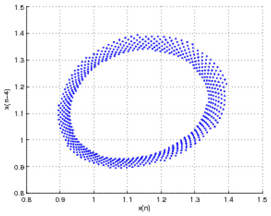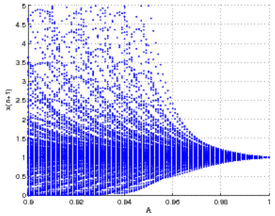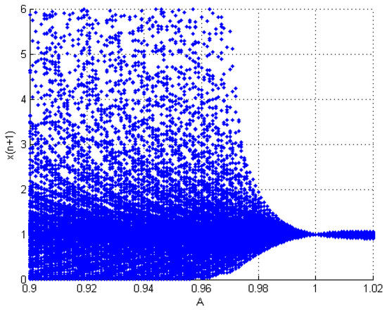 We present some numerical simulations that support our theoretical results about the Neimark–Sacker bifurcation of model (11). We see a bifurcation diagram in Figure 1 in the (A, ) plane. In this figure, , so the critical value of A at which Neimark–Sacker Bifurcation occurs is = , and the initial conditions are . ensures the asymptotic stability of the positive fixed point. In Figure 3, we plot phase portrait by assigning the values , , = 50. Note that, for this value of A, the positive equilibrium point is asymptotically stable. Figure 4 and Figure 5 illustrate phase portraits by assigning values of A near the bifurcation point. In Figure 4, , , = 50 while in Figure 5, , , = . It is noticeable that we move away from the fixed point that the closed invariant curve disappears, which means the curve is subcritical (unstable). By virtue of Theorem 1, supported by Figure 1, the unique positive equilibrium in Figure 3 is unstable whereas in Figure 4, it is stable.