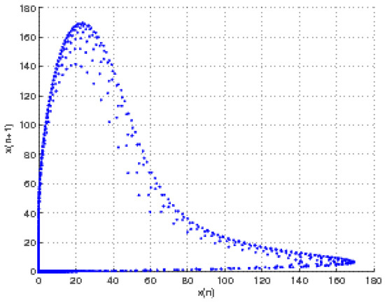 for some parameters and initial conditions, it has unbounded solutions. This paper will not prove this conjecture. Equation (9) is a special case of in the previous equation. Numerical simulations showed that for the range of parameter in Figure 1, the solution of Equation (9) is unbounded. As a result, there is no parabolic shape near the bifurcation value. As you can see in Equation (1), is based solely on and , but in Equation (9), is dependent on , , and . To prove the existence of the Neimark–Sacker bifurcation, the same steps are used, including demonstrating that a complex conjugate pair of modulus one eigenvalues exists as well as studying the direction of the bifurcation. However, the calculations differ. Similar equations can be studied using the details of the calculations. A positive equilibrium , is formed when for Equation (9). The next section examines the local stability of this equilibrium. We then demonstrate that this equation undergoes Neimark–Sacker bifurcation when p crosses a certain critical value . Next, we study the direction of the bifurcation. Finally, we present some numerical simulations that support our theoretical analysis. As a discrete time population model, difference equations have a long history [10]. In most cases, these equations describe autonomous, discrete-time dynamics and assume that the only temporal change in vital rates is due to population density (thereby leading to nonlinear difference equations). Vital rates, however, are affected by a variety of other mechanisms and circumstances. In addition, the population’s physical and biological environment can fluctuate, either systematically (such as daily, monthly, or seasonal changes) or randomly (such as stochastic weather fluctuations, resource availability, etc.). For more results, we refer to [11,12,13,14,15,16,17,18,19,20,21].
