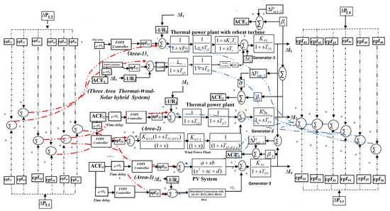 Linearized model of three−area renewable−based (Solar−PV) system with distributed generation.