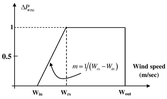 Equation (3) represents cut-in, rated, and cut-out wind speed, respectively, where the straight line passes through the points of cut-in and rated wind speed. The linear approximated model of wind-turbine generator for LFC analysis is given by the first-order transfer function, as defined by (4).