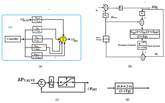 (a) Linearized model of DGS. (b) Schematic block diagram of boiler dynamics in test system 2. (c) Schematic Block diagram of GRC in test system 2. (d) Schematic diagram of governor dead−band in test system 2.