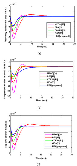 The values of and are assumed to be equal in this situation, i.e., 0.056. The weighted values for the frequency deviation in both locations, and , are used to assign equal importance to tie-line power and frequency responses. Aside from that, a new Honey Badger technique is presented to improve the FOPI controller’s and values. Section 5.2.1 outlines the steps for optimizing the gain value of an FOPI controller with various values of .