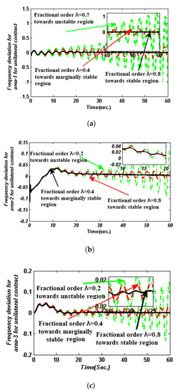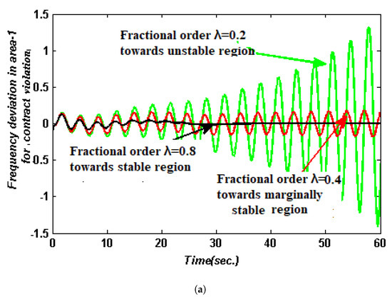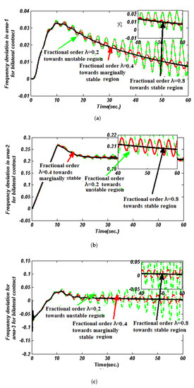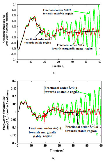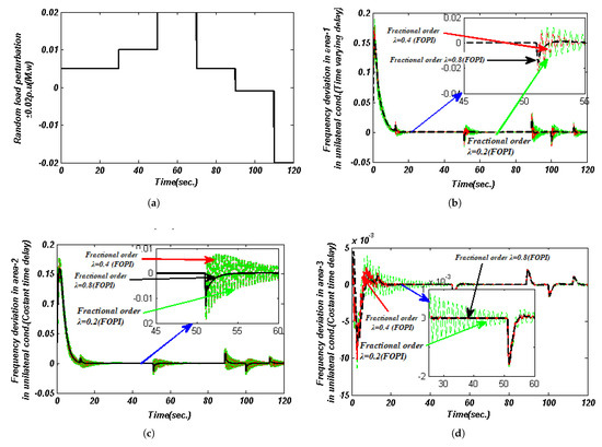 - Using the HBA method, all of the parameters of the FOPI controller in area 1, area 2, and area 3 are stable within the permissible delay margin. An experiment is run with a range of fractional order ( from 0.1 to 0.8) for an FOPI controller with a set of and values maintained within a given delay margin. The investigation shows that the frequency response and tie-line power fluctuations are strongly affected by the controller for a given time delay. Within a specified control parameter set (&), the fractional order () may enhance the delay margin ().