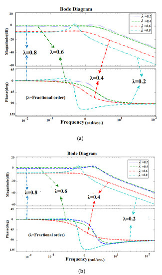The values of and have been utilized to define the basic fractional controller and simulate the individual asymptotic magnitude of the bode plot. Moreover, the stability condition is judged through the evaluation of the delay margin () for different FO controllers ( to ). The value of the delay margin () is evaluated using (36) and (37).