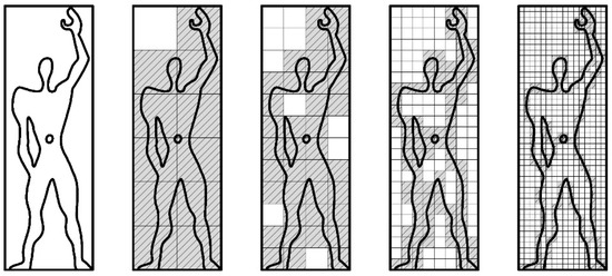 Applying the box-counting method to Le Corbusier’s Modulor (Figure 5), a stylised depiction of the human form based on the golden ratio and Fibonacci numbers, reveals that the fractal dimension (D) is 1.4428 when using just four different grids. In the first grid of 2 by 6 boxes, information is recorded in 11 boxes; the second grid of 4 by 12 boxes records information in 38 boxes, the third grid of 8 by 24 boxes records information in 97 boxes, and the final grid of 16 by 48 boxes records information in 221 boxes. A log–log plot of these results reveals a regression line with a slope of y = 3.0148x − 21.3040 and linear correlation of R2 = 0.9995. Of course, an analysis of a simple image consisting of only three iterations is unlikely to produce an accurate result. For this reason, most researchers use software packages to develop results, one example of which is Image J software [36] employing the FracLac plug-in [37]. Using this software, Le Corbusier’s Modulor Man has a D value of 1.1207, a result befitting a simple line image.