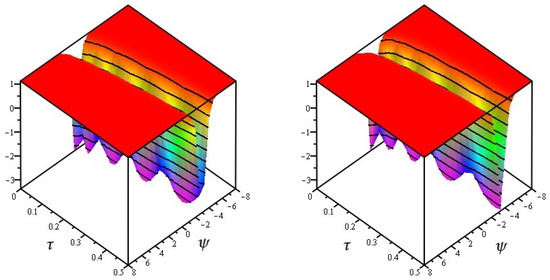 Figure 4, exact and analytical solution of at and and Figure 5, the analytical solutions of at and . Figure 6, the different fractional-order of ϖ of .