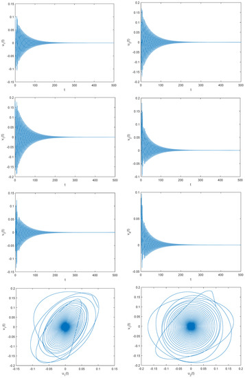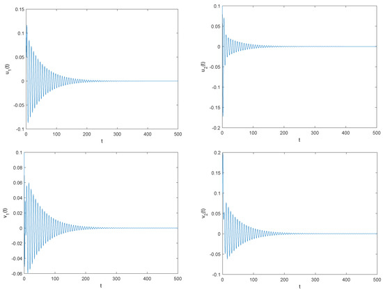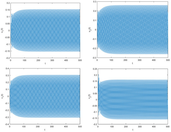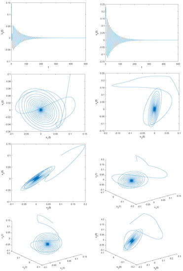 It is clear that the system (32) has an equilibrium point (0, 0, 0, 0, 0, 0). is obtained by numerical calculation. Take , which is . Then we have , and . That is, the (H1)–(H5) are satisfied. When taking , that is, , the Figure 1 can be obtained through Matlab simulation. It is obvious that the zero equilibrium point of the system (32) is locally asymptotically stable. And take , , it can be seen from Figure 2 that the zero-equilibrium point of the system loses its stability and produces Hopf bifurcation.