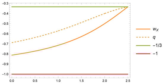 Figure 3 represents the effective state equation of the effective fluid () with the deceleration parameter (q) of the equilibrium point as a function of .