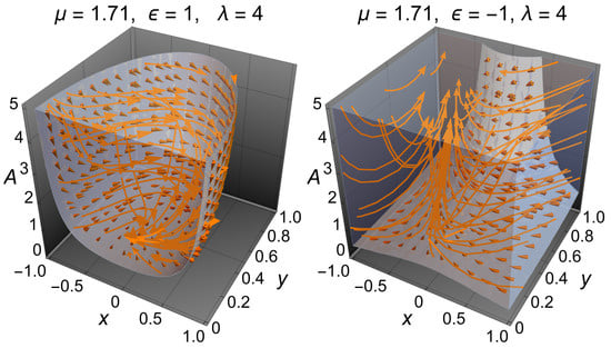 The primary approach uses dynamical systems to determine states and asymptotic solutions []. This study consists of several steps: determining equilibrium points, linearization in their neighbourhood, finding the eigenvalues of the associated Jacobian matrix, checking the stability conditions in the neighbourhood of the equilibrium points, finding the sets of stability and instability and determining the basin of attraction, etc. Lyapunov’s stability theorem is the most general result for determining the asymptotic stability of an equilibrium point. As far as we know, few works have used the Lyapunov method in cosmology [,,,,]. The Lyapunov stability method requires the use of the strict Lyapunov function, the construction of which is laborious, though not impossible. The Hartman–Grobman theorem (Theorem 19.12.6 in [] p. 350) can be used to investigate the stability of hyperbolic equilibrium points of nonlinear autonomous vector fields from the linearized system near the equilibrium point. For isolated non-hyperbolic equilibrium points, the normal forms theorem (Theorem 2.3.1 in []) can be used, which contains the Hartman–Grobman theorem as a particular case. The normal forms of the dynamical system can have periodic solutions for a broad set of initial conditions, implying that an initially expanding closed isotropic universe can exhibit oscillatory behaviour [,]. On the other hand, the invariant manifold theorem (Theorem 3.2.1 in []) affirms the existence of stable and unstable local manifolds under suitable conditions for the vector field. However, it only allows partial information about the stability of equilibrium points to be obtained, and does not provide a method for determining the stability or instability of manifolds.