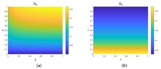Sensitivity analysis of reproduction number according to the model parameters for (a) and q, (b) and .