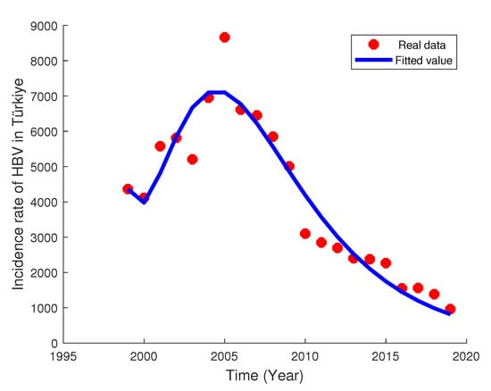 It has been proved that mathematical models created by using ordinary differential equations of integer order are not sufficient in understanding the propagation of biological systems. Using fractional-order mathematical models for biological systems gives closer results because it gives more comprehensive results than integer-order mathematical models. The use of fractional derivative and partial differential equations, especially fractional-order derivatives, which are included in important applications of mathematics that are intertwined with real life, has become widespread. Recently, many scientists have turned their studies to real-life problems [35,36,37,38,39]. This trend ranges from new model structures to real-life problems and the application of fractional-order differential equations. The orders of differential equations specifying physical events determine the rate of change of the physical event in question. Additionally, fractional-order differential equations play an important role in filling some deficiencies in explaining some nonlinear phenomena and in understanding physical phenomena [40,41,42,44,45,46]. The concepts of the fractional derivative and fractional integral have many applications in applied sciences, engineering, finance, geology, thermal sciences, seismology, fluid fluids, elastic theory, thermodynamics, and hydrodynamics [47,48,49,50,51,52]. On the other hand, the earliest systematic studies in this area were performed by Liouville, Riemann, and Holmgren in the 19th century [40]. Apart from Leibniz, many famous mathematicians, such as Riemann, Euler, Liouville, Laplace, and Fourier, have also worked on the fractional analysis. Different fractional derivatives, such as Riemann–Liouville, Caputo, and Grünwald–Letnikov, are used according to the properties of these processes and systems in obtaining the fractional mathematical models of physical processes and systems because each fractional derivative has different properties and advantages over the others [53]. The integer-order derivative provides local modeling, and the fractional-order derivative provides global modeling. Therefore, different studies have been performed by using differential equation models that include fractional derivatives [54,55,56]. The commonly used derivatives related to fractional derivatives in literature are Caputo and Riemann–Liouville fractional derivatives. These derivative definitions have been effectively applied to many real-life problems, such as substance transport, fluid mechanics, population models, control systems, and financial changes. The motivation for this study came from the aforementioned conversation. Our objective is to analyze a fractional-order mathematical model and support it by demonstrating that it fits the real data more closely than the integer-order model. In this context, we propose a fractional-order mathematical model that describes the dynamics of Hepatitis-B in Section 3. Although fractional-order derivative definitions are widely used in the literature, there are some shortcomings arising from definitions. Caputo–Fabrizio (2015) and Atangana–Baleanu (2016) derivative definitions were introduced to eliminate the inadequate aspects of fractional-order derivatives [57,58,59,60,61,62,63,64,65]. These derivative definitions were created by modifying the core function.
