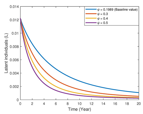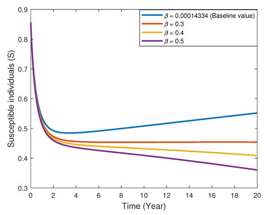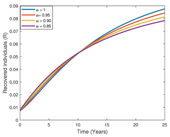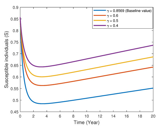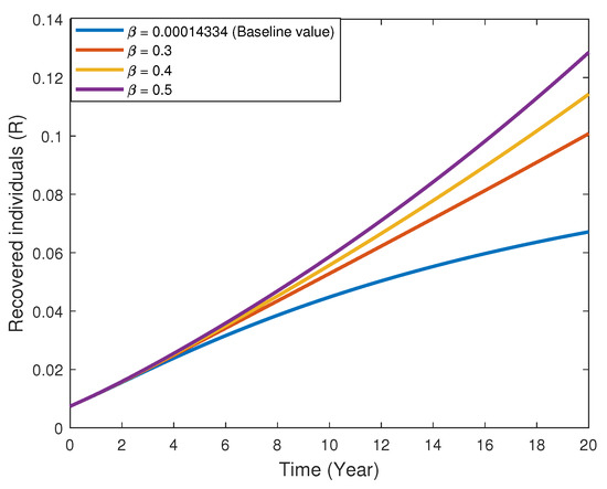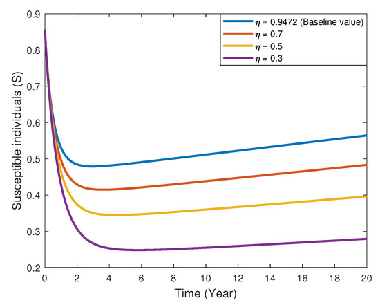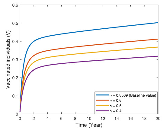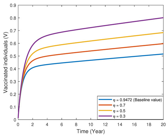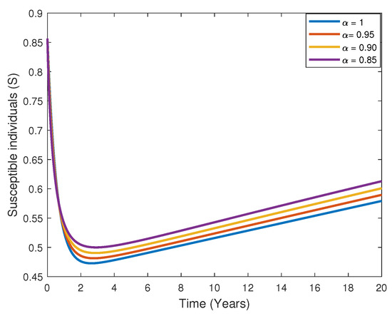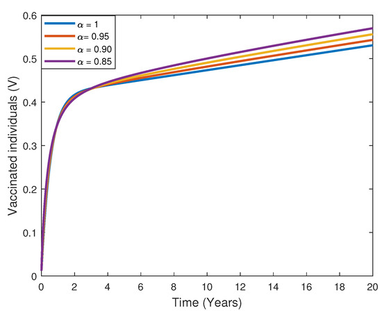 In Figure 19 and Figure 20 for different values of which is the failed vaccination rate, = 0.9472, = 0.2, =0.3, and =0.4, the population time in susceptible individuals’ related variation is studied. Here, the most appropriate value for the real data is calculated as = 0.9472 by parameter estimation method. According to Figure 19, it is observed that as the value increases, the number of susceptible individuals in the population also increases. Similarly, in Figure 20, the time variation of the number of vaccinated individuals for different values is examined. According to the simulation results, as values increase over time, the number of vaccinated individuals also decreases. Here, the opposite of the situation observed in Figure 19 is expected to occur. In other words, an increase in values (increasing number of failed vaccines) will cause a decrease in the number of vaccinated individuals and increase the number of susceptible individuals.