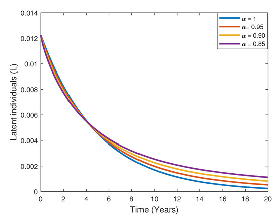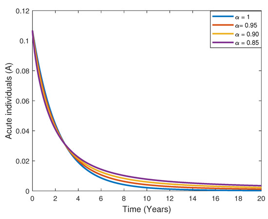 Most of the studies modeling the biological systems are restricted to integer-order ordinary differential equations. Mathematical models, using ordinary differential equations with integer order, have been proved valuable in understanding the dynamics of diseases. However, models with fractional-order differential equations provide more advantages than integer-order mathematical models. The fractional-order models include a memory effect unlike the integer-order models. This special property will be convenient because of the fact that the essential features of the immune system also involve memory. Moreover, in the fractional systems, dimensional consistency is a very important tool, in which the units of measurement from the left- and right-hand sides of the equations are coherent. This consistency can be provided by modifying the parameters involved in the right-hand side of the equations, e.g., raising them to power . In this context, we extended Model (9) to the fractional order, which is presented in the following system: