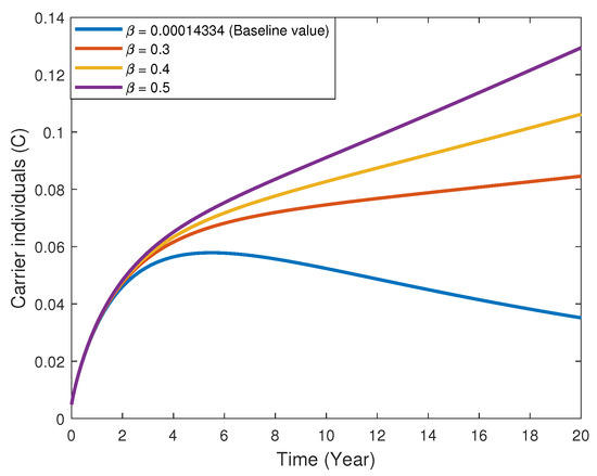 In the sensitivity analysis, one can obtain that the values of increase and decrease in proportion to the growth of , , , , , , , and , , values, respectively. In addition, Figure 1a shows the changes of the reproduction number according to the rate of decrease in immunity with the vaccination strategy () versus the transition rate of individuals with acute infection to carrier class (). Moreover, Figure 1b depicts the changes of the reproduction number according to the vaccination rate () versus the infected rate of mothers with the HB acute virus ().