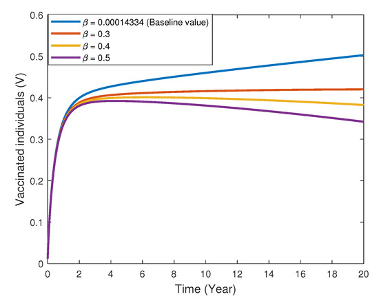 For further reading, one can see [62]. Since indicates the successful vaccine birth rate, the expression is always positive or zero. □