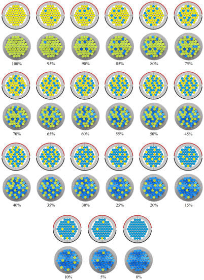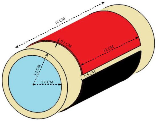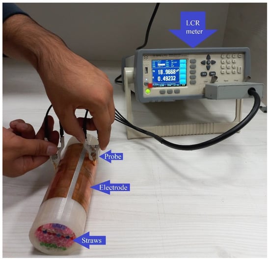 A pipe with a radius of 3.2 cm, length of 18 cm and thickness of 6 mm was made using a 3D printer and PLA material with relative permittivity equal to 3.4. As be shown in Figure 2, a copper plate with a thickness of one millimeter was used for the two electrodes of the concave sensor which were cut by CNC. The distance between the electrodes, the length of each electrode and the electrodes width are 5 mm, 12 cm and 9.55 cm, respectively which are shown in Figure 3. The straws used in the manufactured phantom have a radius of 2.75 mm, a length of 18 cm and a negligible thickness of 0.1 mm. In order to generate different percentages of void fraction in the experiments, specific numbers of straws were filled with water for each percentage and the rest were remained empty. Figure 4 shows the schematic and real mode of fabricated homogeneous phantom in every void fraction percentage. Filled straws with water for different void fractions have been shown with blue color and the rest which were empty or filled with air have been shown with yellow color. In order to measure the capacitance of the fabricated sensor, the measuring was carried out for every generated void fraction from 0% to 100% (21 samples). An LCR meter was used in order to measure the capacitance of each case, which has been shown in Figure 5. To measure the capacity of the fabricated sensor in every void fraction percentage, the voltage and frequency values of the LCR meter were set to 2 volts and 200 kHz, respectively. To check the spatial distribution, the experiments were performed several times with different positions of full straws in every void fraction, and there was a little difference between the obtained results in every void fraction.