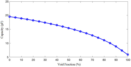 To compare performance of both sensors, their sensitivity relative to void faction changes was evaluated. As can be seen from Equation (1), to calculate the overall sensitivity, the measured capacity of liquid phase (Cliquid) when there is no air inside the pipe (VF0%), and the measured capacity of air (Cair) when the pipe is fully empty (VF100%), are required. Simulation results in Figure 9 show that the concave sensor has an overall sensitivity equal to 19.0594 pF and the ring sensor has an overall sensitivity of 13.5667 pF. Because of higher overall sensitivity, the concave sensor has better performance for the two-phase water-air homogeneous flow regime. For this reason, only the concave sensor’s data were used to train the ANN.