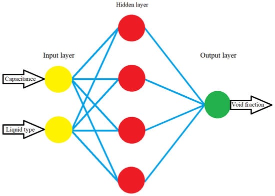 The electric capacitor-based method is a suitable way to measure the void fraction inside the pipe as there is no need to interrupt the process or separate the phases for measuring. In capacitive sensors, type of electrodes and measuring circuit are two main parts for measuring. In this type of sensors, measurement precision highly depends on the configuration of electrodes. On the other hand, there is a direct relationship between the type of liquid inside the pipe and the configuration of electrodes. In order to measure flows in the pipe with two-phase liquid–liquid conductive fluid, the concave electrode is recommended [10,11,12,13,14,15,16]. There are three known different kinds of flow regimes, called stratified, annular and homogeneous. Various papers have studied different regimes with a two-phase fluid inside the pipe. Li and his coworker [17] researched about measurement error and presented that homogeneous sensitivity of the capacitive sensor reducing the measurement error. Many experiments have been performed to improve and develop a structure for ensuring homogeneous sensitivity and it was found that a helical electrode has more homogeneous sensitivity [18,19,20,21,22,23,24]. In [20] by Jaworek and Krupa, five different configurations such as helix, concave, and double ring were used to investigate two-phase water-air flow. The concave configuration showed the best sensitivity. Moreover, in [21], the highest and lowest sensitivities of the capacitance sensor in two-phase water-air flow were obtained for the concave and double ring configuration, respectively. Air–solid two-phase flow has investigated in [22] by Kendoush and Sarkis. In this work, different electrodes such as concave, parallel plate, ring and helical have been investigated. It was found that the concave electrode has the best sensitivity. For two-phase liquid/gas non-conductive fluid, Sami and Abouelwafa [23] used six different capacitors. The capacity of each capacitor has been measured by a capacitor meter. Studies have been carried out on oil–gas two-phase flow, and the helical electrode had best sensitivity among all electrodes. Moreover, the concave electrode has provided best results for the annular regime. Tollefsen and his coworker [24] studied two-phase oil–water mixture. Capacitance dependence to type of regime and distribution are main weakness of capacitive sensors using direct plate surfaces, and accurate results can only be obtained if components have been well mixed. If dimensions of bubbles are less than the volume of substance, the obtained mixture is almost homogeneous. In [25], Ahmed used a capacitive sensor to measure void fraction and detect the type of regime. In that research, investigations were carried out on air–oil two-phase fluid in a horizontal pipe. Concave and ring electrodes have been investigated, and it was shown that the ring electrode has more sensitivity. Among the existing limitations for measuring the amount of void fraction, the effect of the type of configuration on measured response has been mentioned. Artificial Neural Network (ANN) is one of the most powerful mathematical tools, which is widely used in a wide variety of fields, for instance, electrical engineering, control engineering and so on [26,27,28,29,30,31,32,33,34,35,36,37,38,39]. Performance of capacitance-based two phase flow meters highly depends on the fluid properties. Fluctuation of the liquid phase properties such as density due to temperature and pressure changes would cause massive errors in determination of the void fraction. A common approach to fix this problem is periodic recalibration of the system, which is a tedious task. The novelty and aim of this study is in proposing a method based on artificial intelligence (AI), which offers the advantage of intelligent measuring of the void fraction regardless of the liquid phase changes without the need for recalibration. To train AI, a data set for different liquid phases is required. Although it is possible to obtain the required data from experiments, it is time-consuming and also incorporates its own specific safety laboratory consideration, particularly working with flammable liquids such as gasoline, oil and gasoil. So, COMSOL Multiphysics software was used to model a homogenous regime of two-phase flow with five different liquid phases and void fractions. To validate the simulation geometry, initially an experimental setup including a concave sensor, a pipe consists of a homogeneous regime which is modelled by several straws with different void fractions created by filling some of them [40]. After validation of the simulated geometry for the concave sensor, a ring sensor was also simulated to investigate the best sensor type. It was found that the concave type has a better sensitivity. Therefore, the concave type was used to measure the capacitance for different liquid phases and void fractions inside the pipe. Finally, simulated data are used to train a MLP neural network model.