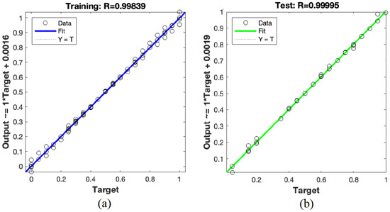 In the used neural network, the data were randomly divided between the training data and the test data, and 70% of the data were used for training and the rest were used for test data. Furthermore, the performance of the network was examined using the Mean Absolute Error (MAE) of test data. Using trial and error the best architecture was obtained and saved. In Figure 11a, a regression diagram of the training data and in Figure 11b a regression diagram of the test data were given. MAE for the training data and test data are equal to 1.74 and 1.33, respectively. To prevent over-fitting and under-fitting, the obtainable data are separated into two categories: training data and test data. The training data include the information seen by the neural network and is used to create the model. After the neural network has been trained, its performance may be evaluated using test data. As long as the neural network responds appropriately to these two data sets, as shown in Figure 11a,b, the proposed network will be safe from over-fitting and under-fitting problems, respectively.
