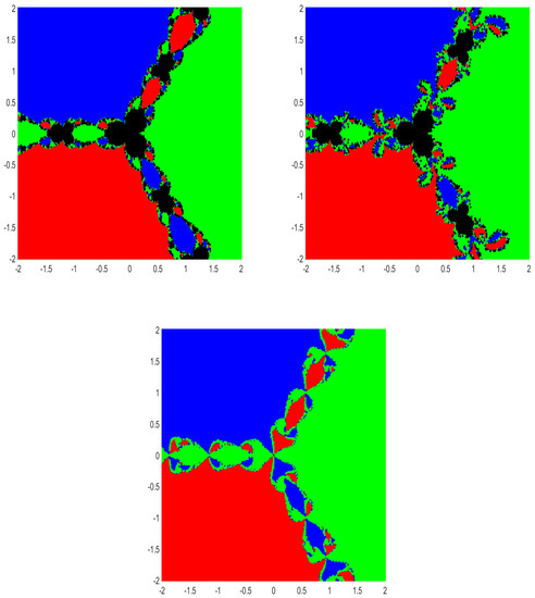 Figure 1, Figure 2 and Figure 3 demonstrate the BA corresponding to each root of the above examples (Examples 5–7) for Methods (2), (3) and (4). The JS (black region), which contains all the initial points from which the iterative method does not converge to any of the roots, can easily be observed in the figures.