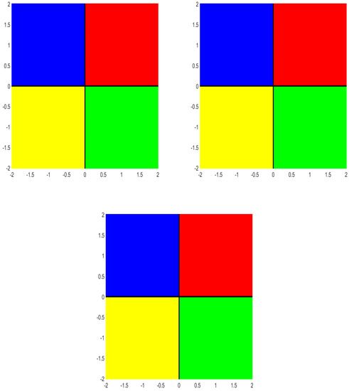 The region which contains all the roots of Examples 5–7 is used to plot BA and JS. We choose an equidistant grid of points in as the initial guess , for Methods (2), (3) and (4). A tolerance level of and a maximum of 50 iterations are used. A color is assigned to each attracting basin corresponding to each root, and if we do not obtain the desired tolerance with the fixed iterations, we assign the color black (i.e., we decide that the iterative method starting at does not converge to any of the roots). In this way, we distinguish each BA by their respective colors for the distinct roots of each method.