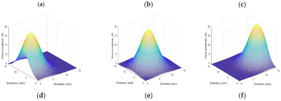 In addition, a 3D graph of the modulus of the exact analytical solution of the 2D NLSE, employing a bright soliton has been exhibited in Figure 1. This solution has been computed over x and y domains of [−20, 20] [−20, 20] at time . Moreover, the SSFT method has been implemented to solve Equation (1) over x and y domains of [−30, 30] [−30, 30] at a time sequence of , , and . This process has resulted in discretizing the square physical domain into an equally spaced grid of 301 301 points, while executing the different values of time required for the consecutive software iterations of 1001, 3001, and 6001, respectively. The dynamic behavior of the obtained results is demonstrated in Figure 2. Specifically, the 3D graphs are presented in Figure 2a–c, whereas Figure 2d–f represent the 2D graphs of the resulted approximate solution. The corresponding contour plots are clearly shown in Figure 2g–i.