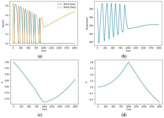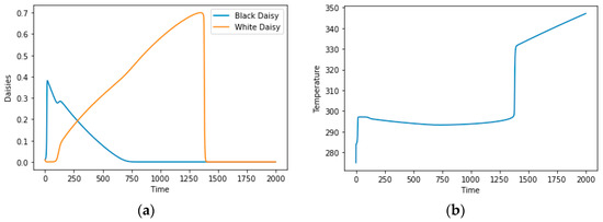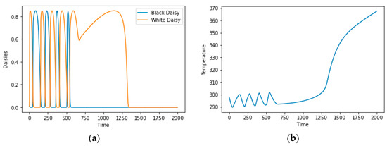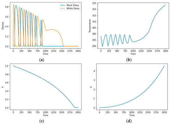 Life–environment interactions of the classical Daisyworld considering greenhouse gases and : (a) daisy populations; (b) temperature; (c) daisy population subspace.