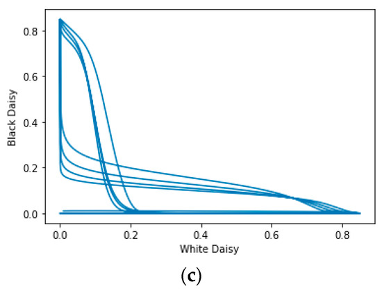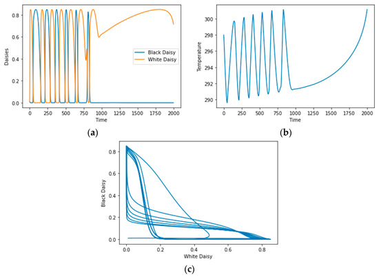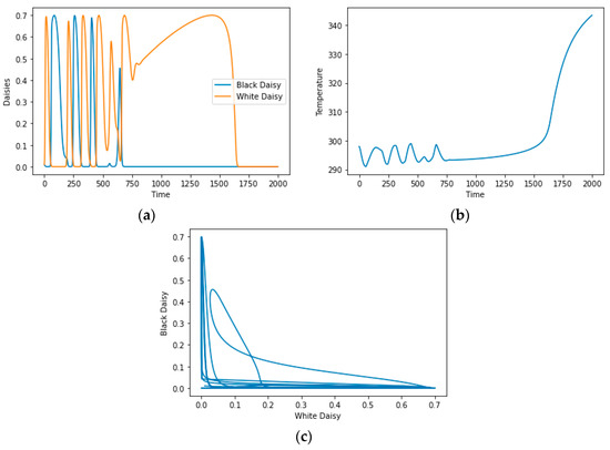 Life–environment interactions of the classical Daisyworld considering thermal inertia: (a) daisy populations; (b) temperature; (c) daisy population subspace.