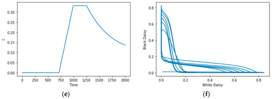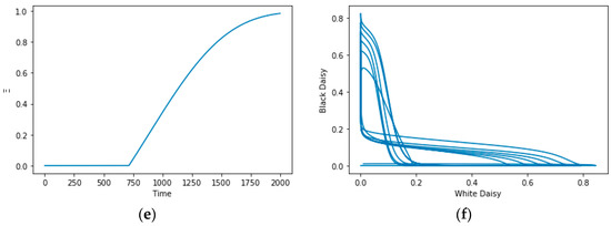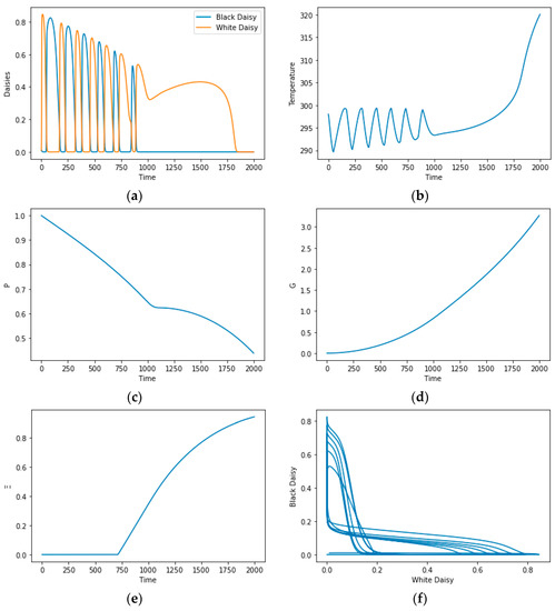 Life–environment interactions in the Daisyworld associated with the revenge of Gaia: (a) daisy populations; (b) temperature; (c) planet fertile area; (d) Gaia state; (e) Gaia phase transformation; (f) daisy population subspace.