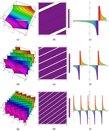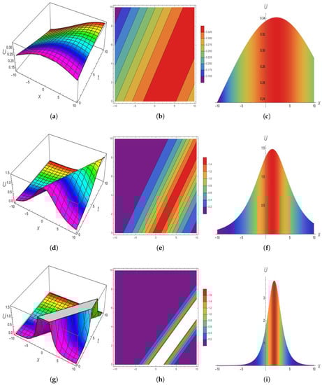 Three-dimensional, contour, and 2-D profiles of solution for different values of parameter k. (a) Three-dimensional propagation at ; (b) Contour propagation at ; (c) Two-dimensional propagation at ; (d) Three-dimensional propagation at ; (e) Contour propagation at ; (f) Two-dimensional propagation at ; (g) Three-dimensional propagation at ; (h) Contour propagation at ; (i) Two-dimensional propagation at .